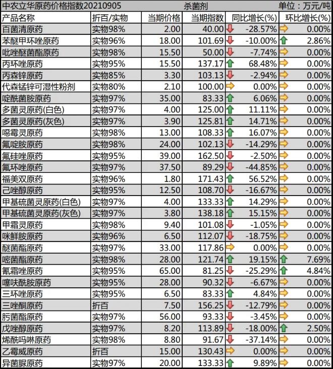 三唑類產(chǎn)品市場(chǎng)受開工率影響較大,上游三氮唑的大幅上漲給了較大成本壓力:苯醚甲環(huán)唑原藥目前低位反彈,市場(chǎng)價(jià)格報(bào)18萬(wàn)元/噸以上;丙環(huán)唑原藥廠家忙于交付前期訂單,成本高位,開工率不足,價(jià)格上漲到15.5萬(wàn)元/噸;己唑醇原藥市場(chǎng)供應(yīng)增加,價(jià)格報(bào)到12.5萬(wàn)元/噸;戊唑醇原藥較為穩(wěn)定,目前報(bào)到8.2萬(wàn)元/噸;三環(huán)唑原藥廠家開工率低,基礎(chǔ)原材料上漲帶來(lái)了成本壓力,市場(chǎng)價(jià)格報(bào)到6.5萬(wàn)元/噸;氟環(huán)唑原藥市場(chǎng)開工率提升,流通貨源價(jià)格下滑到37.5萬(wàn)元/噸,隨著價(jià)格下行,終端制劑的性價(jià)比提升。
