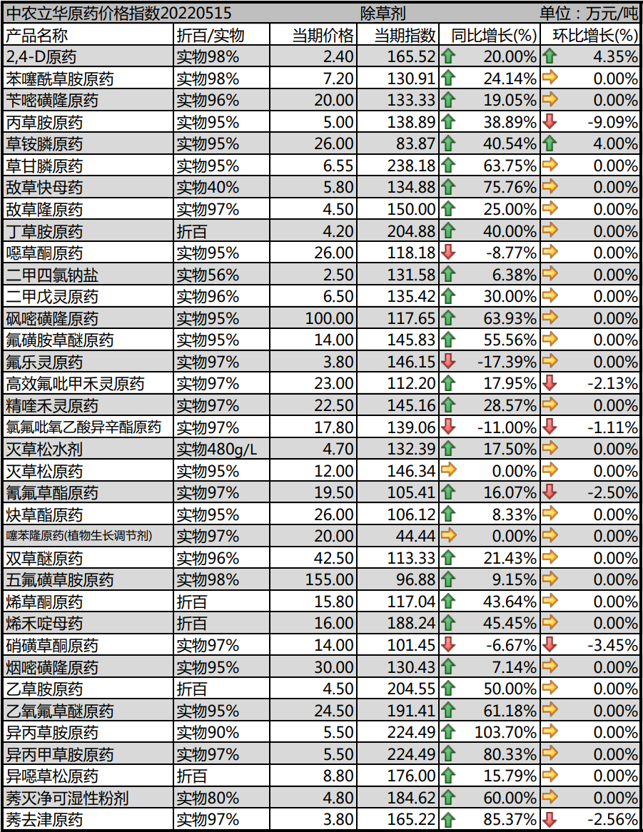 2,4-D原藥基礎(chǔ)原材料上漲,對行情起到支撐,本月價格報到2.4萬元/噸;二甲戊靈原藥目前開工率仍然不足,市場庫存偏低,外貿(mào)訂單排到下半年,價格在6.5萬元/噸的高位。