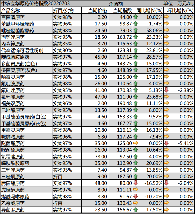 多菌靈原藥生產(chǎn)廠家環(huán)保壓力較大,市場報價維持在4.6萬元/噸左右;甲基硫菌靈原藥成本壓力大,市場價格報到4.6萬元/噸左右;噁霉靈原藥市場價格在15萬元/噸左右;氟啶胺原藥庫存消化,出口市場良好,市場價格回落到26萬元/噸;咪鮮胺原藥市場弱勢,廠家成本高位,艱難維持,價格上調(diào)到6.8萬元/噸。