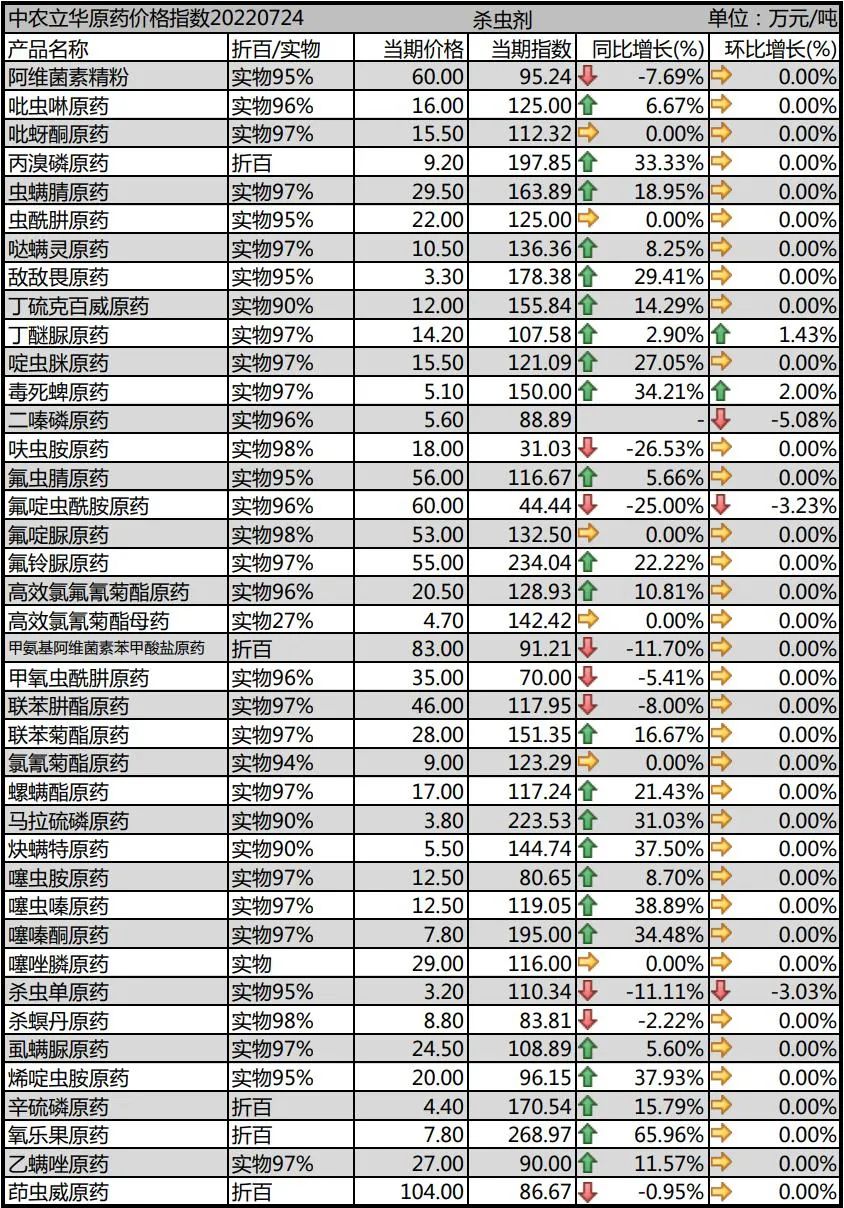 氟啶脲原藥供貨正常,價(jià)格報(bào)到53萬(wàn)元/噸;氟鈴脲原藥報(bào)55萬(wàn)元/噸;虱螨脲原藥工廠開工率降低,庫(kù)存減少,但需求偏弱,價(jià)格穩(wěn)定在24.5萬(wàn)元/噸;乙螨唑原藥開工率也降低,庫(kù)存減少,成本支撐,價(jià)格報(bào)27萬(wàn)元/噸。