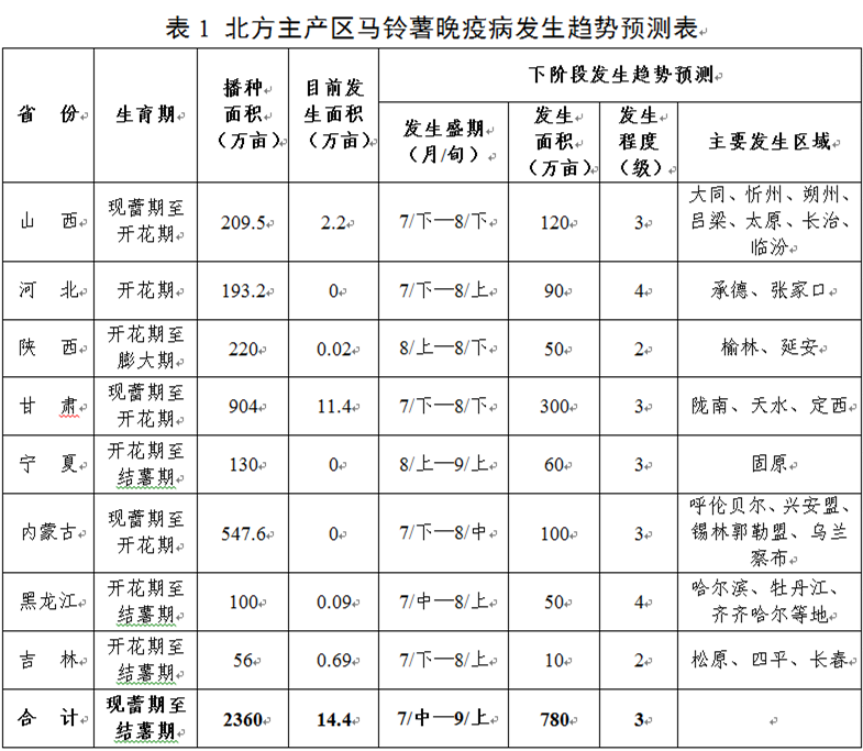 據(jù)監(jiān)測,今年北方馬鈴薯主產(chǎn)區(qū)田間菌源量充足,種植品種抗病性不高,天氣條件適宜晚疫病流行,預(yù)計馬鈴薯晚疫病在西北、華北、東北主產(chǎn)區(qū)中等發(fā)生,黑龍江中西部、內(nèi)蒙古大興安嶺及陰山沿麓、甘肅東南部和中部、寧夏南部、河北北部、山西北部等地局部偏重發(fā)生;預(yù)計發(fā)生面積780萬畝。病害流行盛期,東北地區(qū)為7月中旬至8月上旬,西北、華北地區(qū)為7月下旬至8月下旬(表1)。