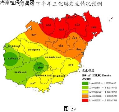 ③、三化螟:預(yù)計偏重發(fā)生,發(fā)生面積65萬畝次,主要發(fā)生地區(qū)有北部的海口、臨高、儋州、澄邁,各市縣發(fā)生情況預(yù)測如圖3。