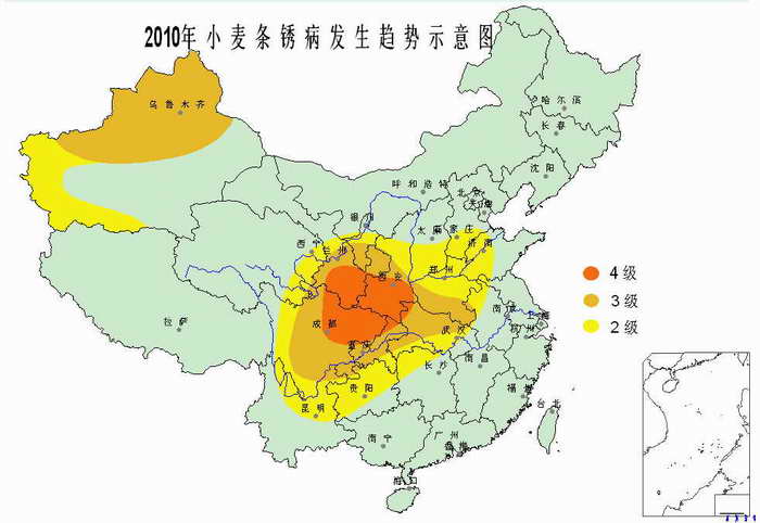 條銹病顯著輕于上年,將是2001年持續(xù)偏重流行以來(lái)發(fā)生較輕的一年。其中,四川盆地沱江、嘉陵江和涪江流域、甘肅南部和中部晚熟麥區(qū)、陜南西部和關(guān)中西部偏重流行,以上3省的其他地區(qū)、湖北北部和西部、河南南部、寧夏南部陰濕山區(qū)、新疆大部中度流行,重慶、河南中北部、山東西南部、山西和河北南部、青海東部偏輕流行。流行盛期,西南地區(qū)東部、陜西南部、湖北為4月中、下旬,甘肅南部、陜西關(guān)中、河南南部為4月下旬至5月上旬,河南北部、山東、山西、河北為5月上、中旬,甘肅隴東、寧夏、新疆為5月中旬至6月中旬。