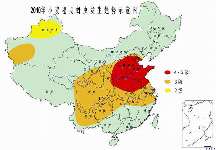 蚜蟲(chóng)輕于大發(fā)生的上年、重于常年。其中,黃淮海麥區(qū)偏重至大發(fā)生,西南、長(zhǎng)江中下游和西北大部中等發(fā)生。危害盛期,長(zhǎng)江中下游為4月下旬至5月中旬,北方麥區(qū)為5月上旬至6月上旬。