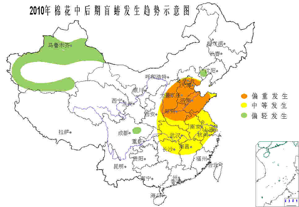 據(jù)國家氣象中心預(yù)測, 7 月份,長江流域和黃河流域北部棉區(qū)降水偏多,除山東南部、江蘇北部、安徽北部、湖北東北部氣溫偏低外,其他大部棉區(qū)氣溫基本持平,對枯黃萎病和棉盲蝽發(fā)生有利,對棉鈴蟲、棉蚜、棉葉螨等害蟲發(fā)生有一定抑制作用。但新疆、河北、山西、陜西和山東北部降水偏少、氣溫偏高,對當(dāng)?shù)孛掴徬x、棉蚜、棉葉螨發(fā)生有利。