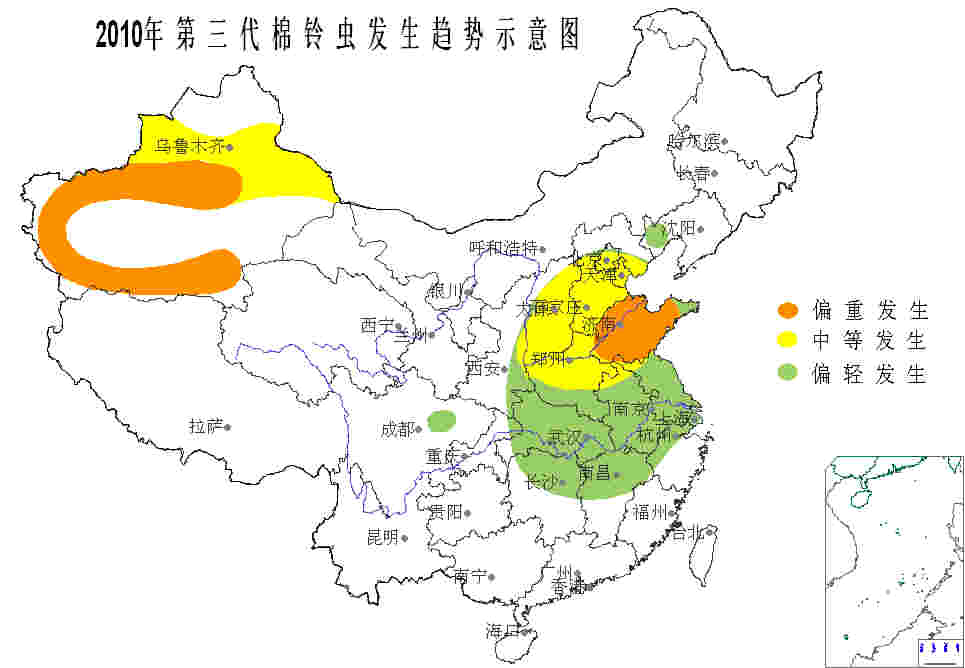 三代棉鈴蟲預(yù)計 發(fā)生 3500 萬畝。 黃河流域和新疆棉區(qū)中等發(fā)生,其中山東大部、新疆南疆偏重發(fā)生;長江流域棉 區(qū)偏輕發(fā)生。 各地第二代成蟲盛期 (成蟲盛期推后 3 天即為三代卵盛期)較常年推遲 3-9 天, 預(yù)測時期如下: