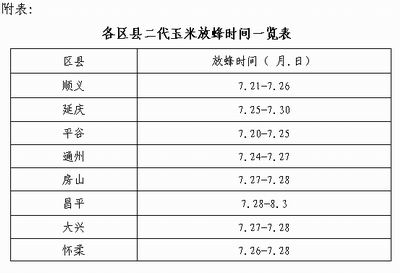 赤眼蜂防治玉米螟卵,釋放適期為7月20日-7月30日(見附表),放蜂次數(shù)1-2次,兩次間隔5天,其中第一次在產(chǎn)卵初期,第二次在產(chǎn)卵盛期,每畝放蜂點(diǎn)數(shù)1-2個(gè),放蜂數(shù)量1-2萬(wàn)頭。