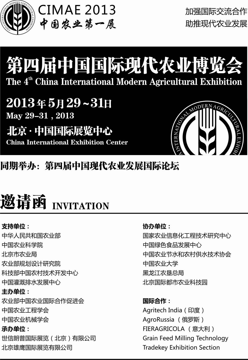 由農(nóng)業(yè)部中國農(nóng)業(yè)國際合作促進(jìn)會(huì)、中國農(nóng)業(yè)工程學(xué)會(huì)與中國農(nóng)業(yè)機(jī)械學(xué)會(huì)聯(lián)合主辦,世信朗普國際展覽(北京)有限公司、北京雄鷹國際展覽有限公司聯(lián)合承辦的“第四屆中國國際現(xiàn)代農(nóng)業(yè)博覽會(huì) (CIMAE 2013) ”將于 2013 年 5 月 29 日 至 31 日在北京•中國國際展覽中心(老館)舉行,預(yù)計(jì)展出面積 20000 平米,將匯聚超過 500 家國內(nèi)外農(nóng)業(yè)相關(guān)展商 , 展示現(xiàn)代農(nóng)業(yè)新產(chǎn)品與新技術(shù),博覽會(huì)同期將舉辦內(nèi)容豐富的高端論壇、展商技術(shù)交流會(huì)、新產(chǎn)品發(fā)布會(huì)等多項(xiàng)重要活動(dòng)。 CIMAE 將更加重點(diǎn)突出國際化和品牌化,同時(shí)也將邀請更多的國外行業(yè)組織機(jī)構(gòu)組團(tuán)到會(huì)參觀、采購與交流,使 CIMAE 在促進(jìn)國際交流、合作與貿(mào)易,推動(dòng)我國農(nóng)業(yè)現(xiàn)代化健康快速發(fā)展發(fā)揮更加積極的作用。