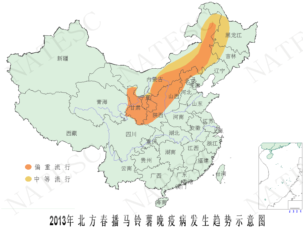 據(jù)全國(guó)農(nóng)作物重大病蟲監(jiān)測(cè)網(wǎng)監(jiān)測(cè),今年我國(guó)北方春播馬鈴薯晚疫病見病早、菌源量充足,馬鈴薯主栽品種抗性差,易感病期氣象條件適宜,預(yù)計(jì)馬鈴薯晚疫病在我國(guó)北方大部將偏重至大流行,流行面積可達(dá)2000萬畝。病害流行盛期,黑龍江、內(nèi)蒙古、河北北部、山西中北部在7月下旬至8月中旬,甘肅在7月下旬至9月上旬,寧夏、陜西北部在8月中旬至9月上旬。