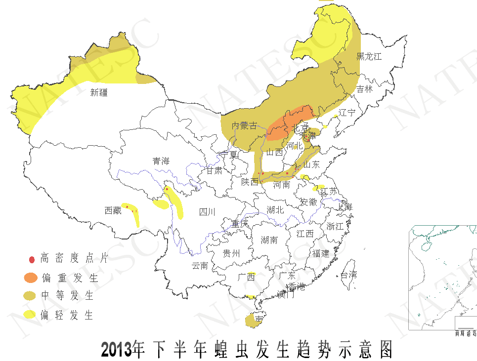 據(jù)國家氣候中心預測,7-8月份,環(huán)渤海灣蝗區(qū)降水偏多2-5成,對東亞飛蝗出土與發(fā)育有一定的抑制作用;黃河灘區(qū)和華北湖庫蝗區(qū)、西北和西南大部和華南南部等其他主要蝗區(qū)降水正常略偏多,氣溫與常年持平略高,對蝗蟲發(fā)生無明顯不利影響。