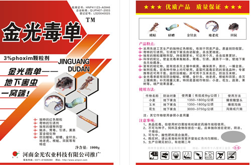采用先進(jìn)復(fù)合肥造粒工藝生產(chǎn)的獨特紅色顆粒劑—金光毒單,可有效防治螻蛄、蠐螬、金針蟲、地老虎、線蟲和田鼠;殺滅土壤病菌;補充微量元素,特別是喜硫作物,如:小麥、花生、蔬菜、果樹等作物,增產(chǎn)效果顯著。